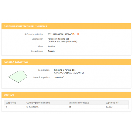 Se vende Parcela perteneciente al término de Alicante, en la zona de Salinas partida Paraje Camara. Se trata de 10.001,86m2 de suelo rústico, la parcela tiene 200m2 edificables (2%). La zona esta muy cercana al pueblo de Salinas y Sax. Muy buena comunicación vial ya que tiene cerca la autovía A-7. La parcela es colindante con 3 parcelas más con las características muy parecidas. Ref.Catastral 03116A00600160000AS 10.001,35m2, 03116A00600159000AU 10.015,16m2 y 03116A006001620000AU 10.001,57m2. Todas las parcelas con edificables 200m2 (2%).